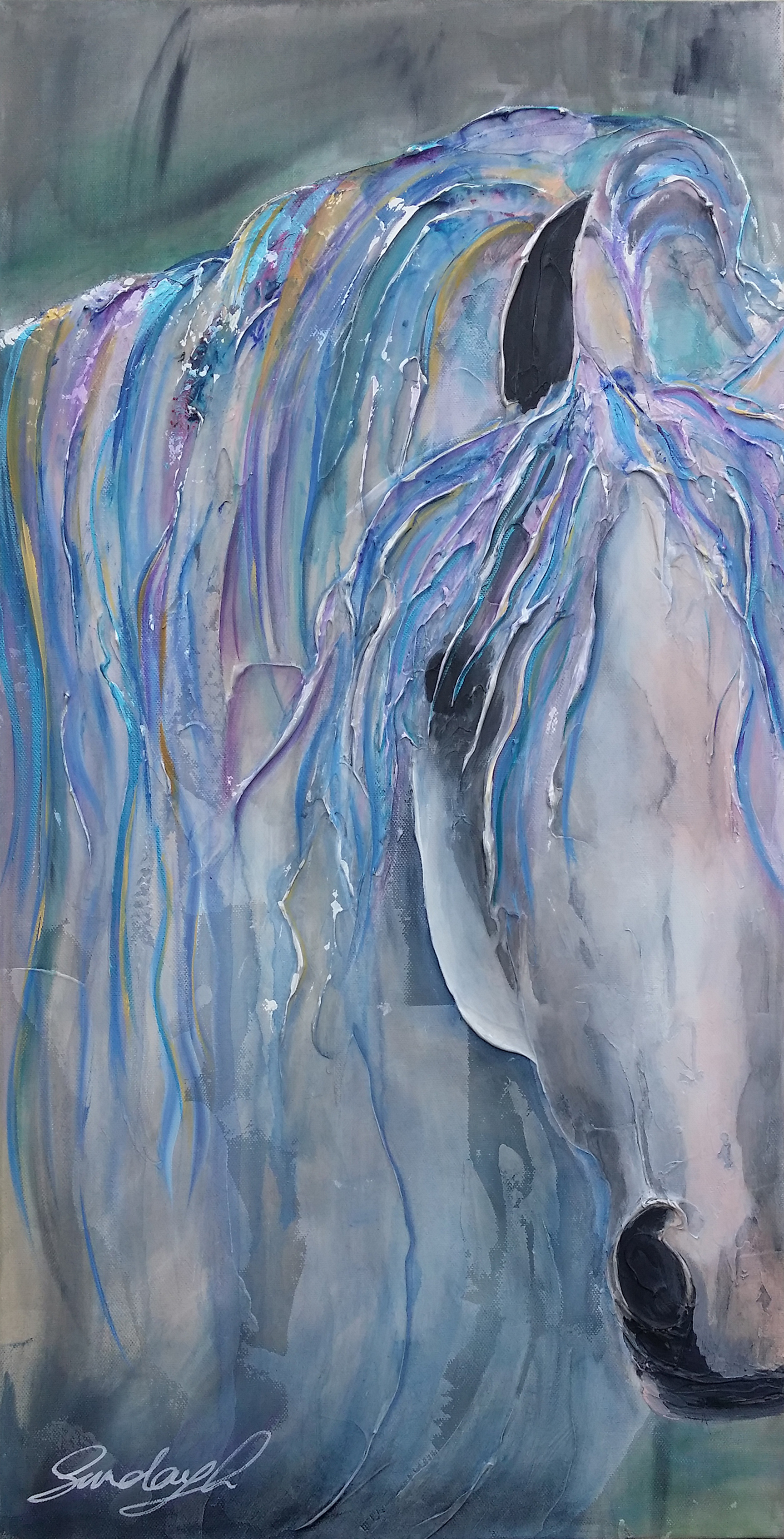 Inspired by the beauty of horses and their gentle nature. Grey Blue Soul conveys a gentleness, with a tinge of a sombre, thoughtful mood.